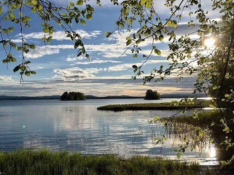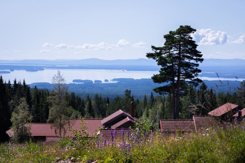 Fantastic view of Lake Orsa and Dalarna’s blue mountains