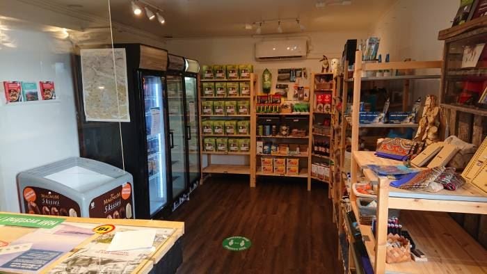 Food and equipment for outdoor activities are sold in the shop. The range of goods differs from facility to facility.