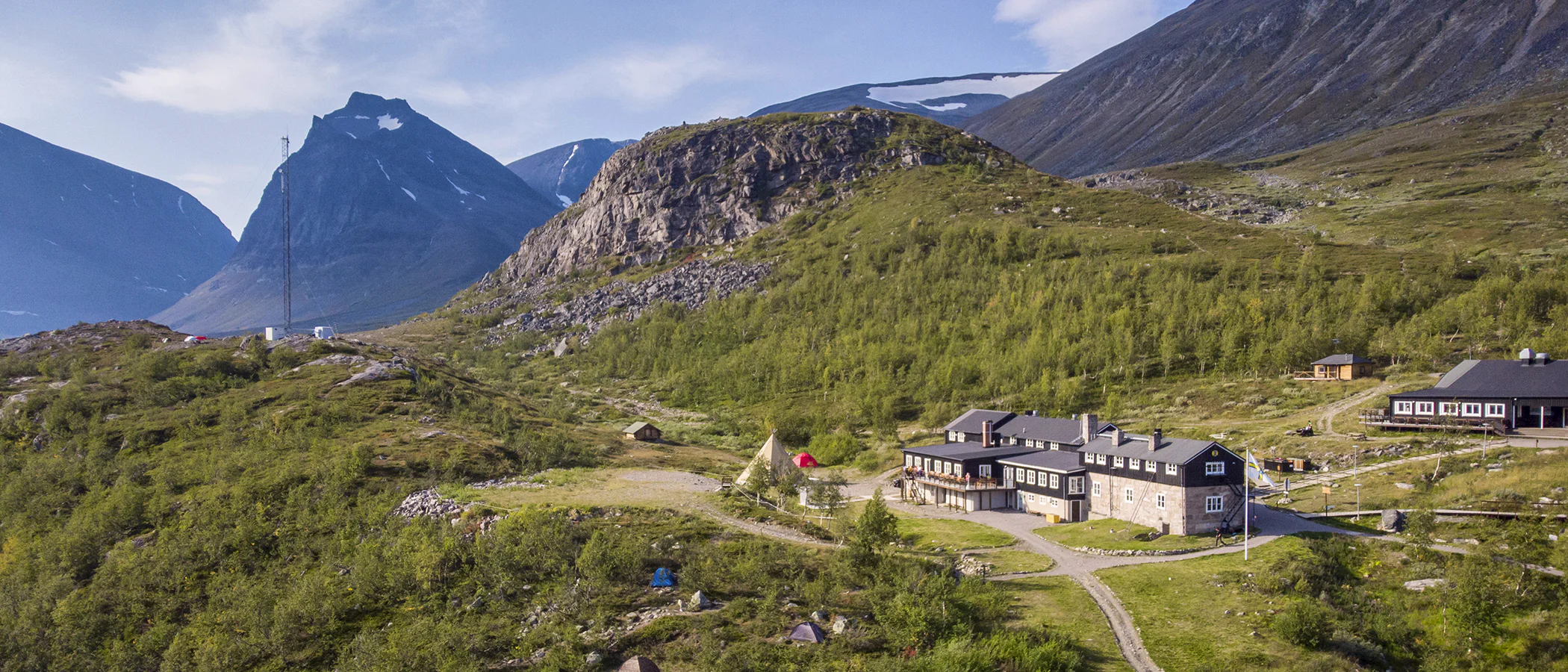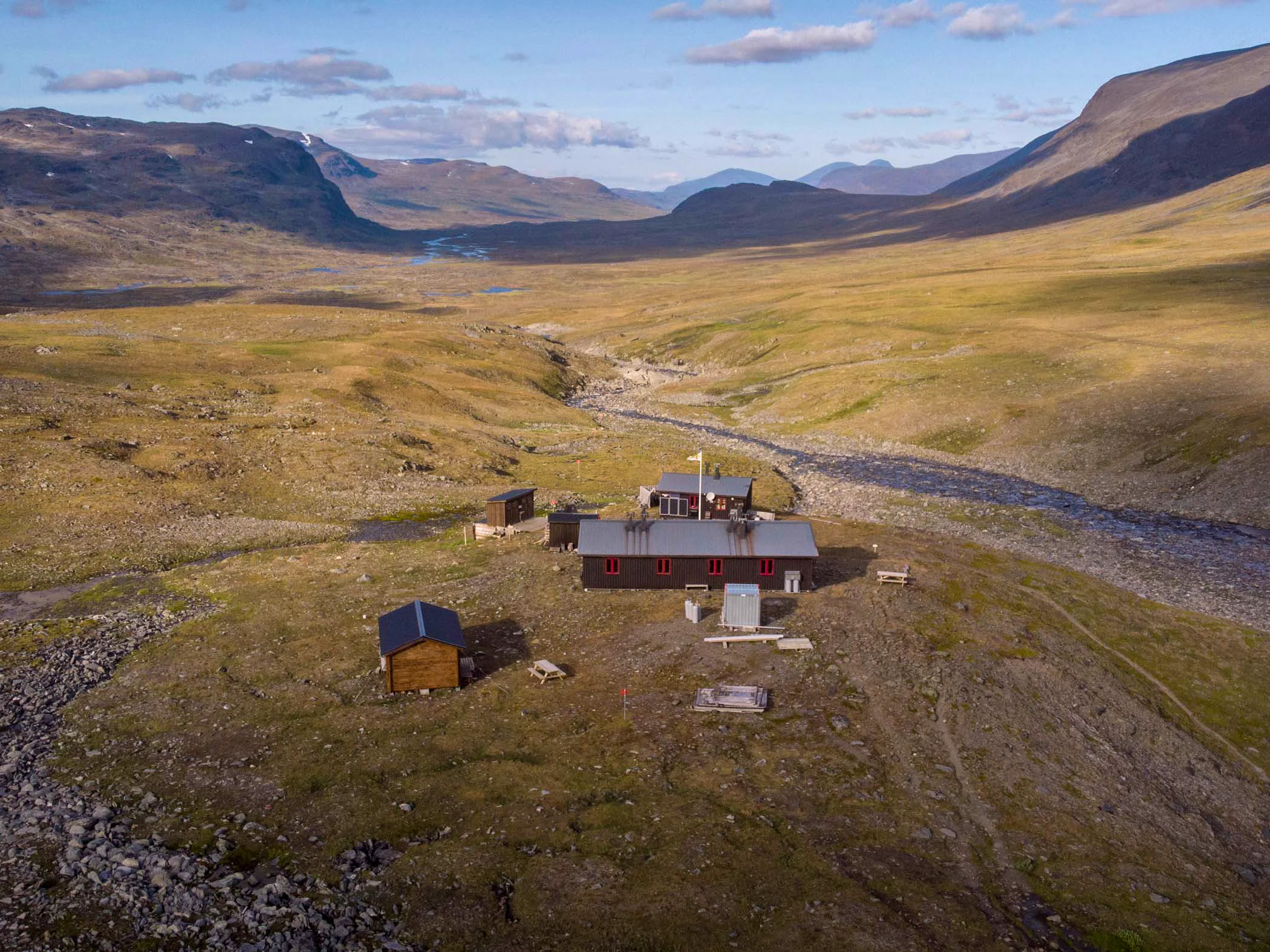 After four kilometers, you reach the highest point of the Kungsleden, Tjäktjapasset, at 1,150 meters above sea level. There is a shelter here. On the way down, the rocky terrain gives way to greener surroundings. As you descend into the impressive Tjäktjavagge valley, the landscape becomes increasingly lush. The valley stretches for 30 km and is surrounded by high mountains. Water can be collected from streams along the trail. STF Sälka Mountain Hut has a mountain shop with a Large selection.