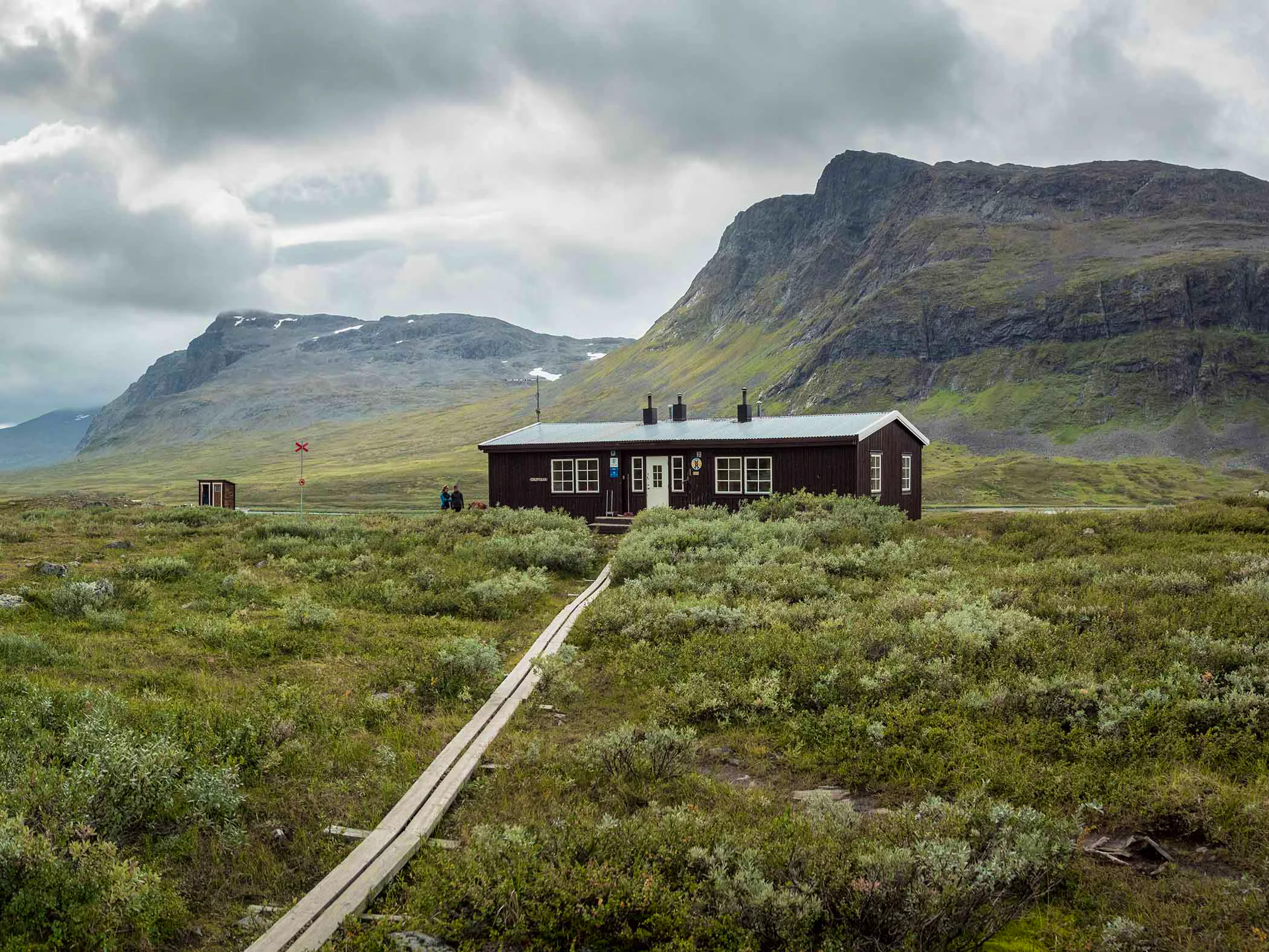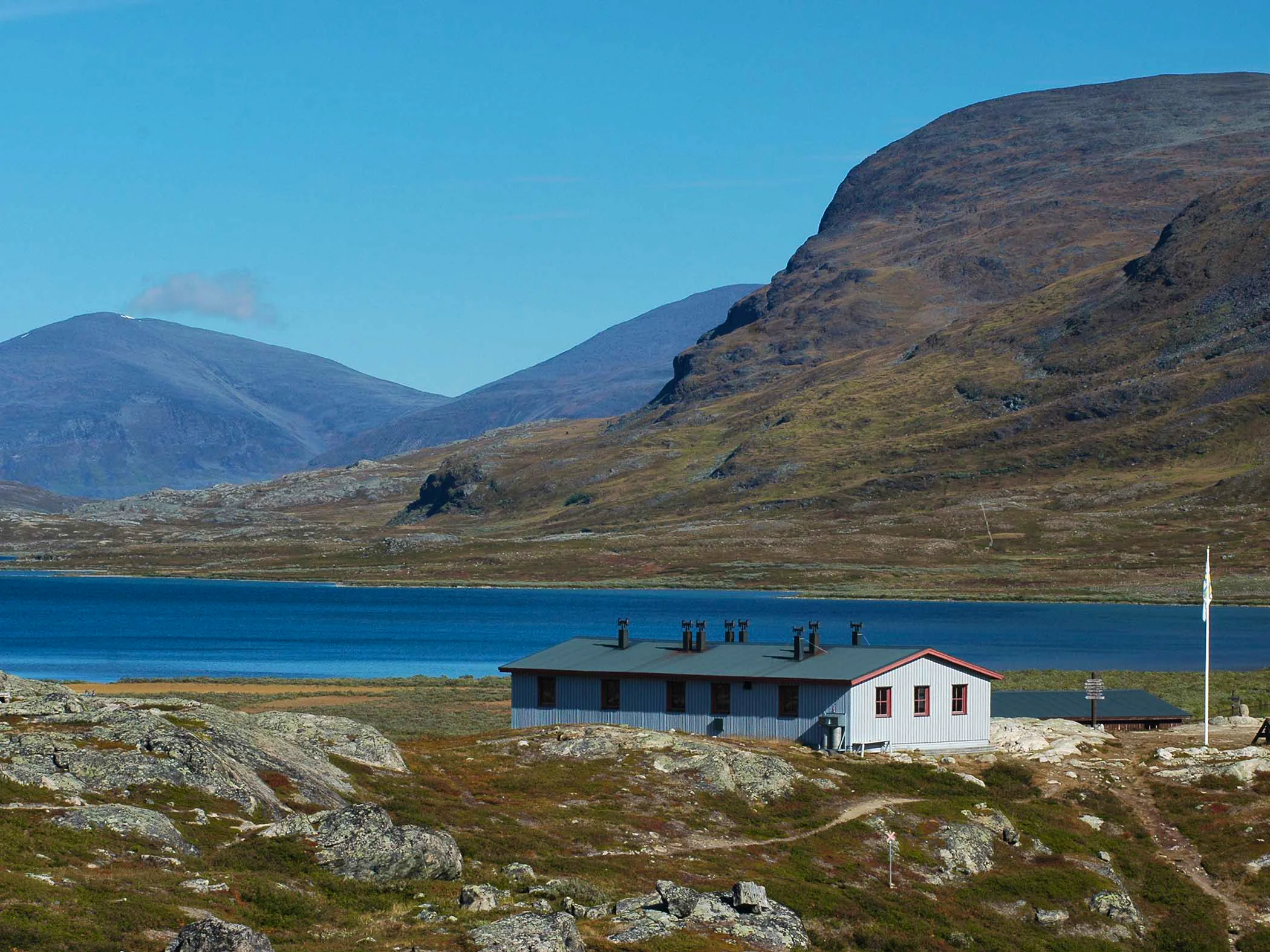 The hike continues through Tjäktjavagge as the valley widens and the terrain remains easy to walk. High mountains, steep cliffs, and glaciers line your path across fertile alpine heaths. There is a shelter at Kuoperjåkka. You cross many streams and wooden bridges. Just before Singi, the trail becomes more winding and rocky. This stretch may be one of the most beautiful in Sweden—depending on who you ask! Water can be collected from streams along the trail. STF Singi Mountain Hut has no shop, so you need to carry your own food.